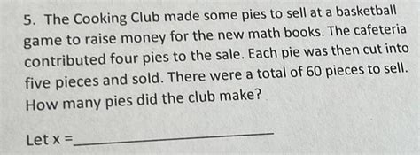 1. Katie made 5 pies. The pies were divided equally among her 4 brothers. How many pies did each bother receive?